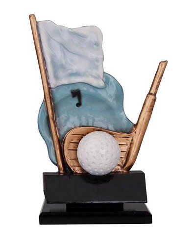 Troféu em resina motivo Golfe. Detalhes: bandeira, taco e bola.
