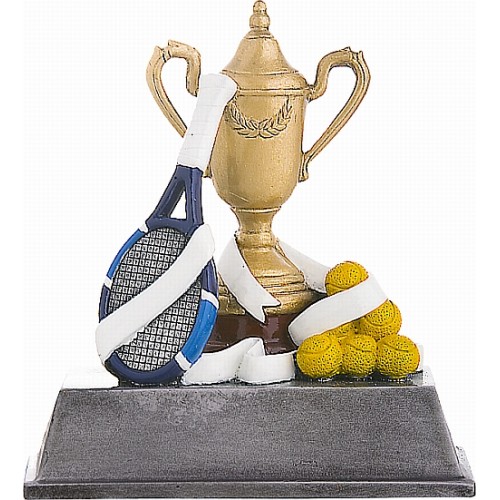 Troféu colecção Ténis em resina. Um troféu colorido e original com elementos decorativos em miniatura: taça, bolas e raquete.