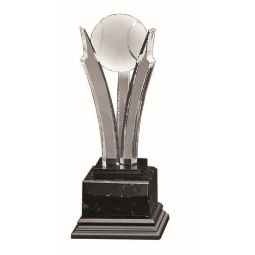 Troféu em acrílico com aplique de bola de ténis em cristal. Base em mármore preto.